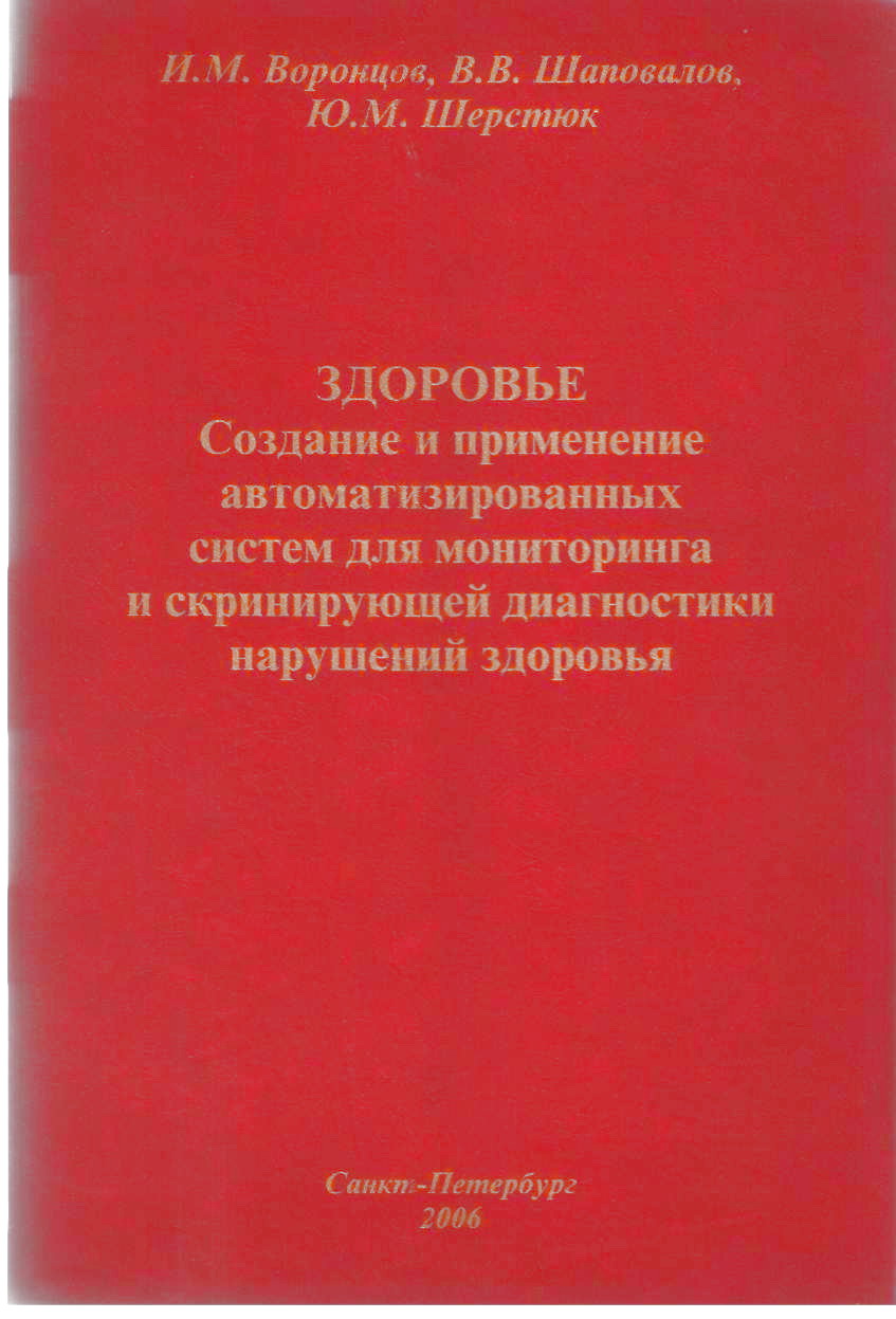 Воронцов И.М., Шаповалов В.В., Шерстюк Ю.М. ЗДОРОВЬЕ. Создание и применение автоматизированных систем для мониторинга и скринирующей диагностики нарушений здоровья. - Санкт-Петербург: 2006.